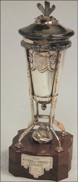 While 52 wins represented a slip for the team, it was unmatched in the Wales conference and the Canadiens captured the regular season conference title for the fourth consecutive year. The NHL presented this personal miniature to Guy Lafleur for his part in this memorable season. Four towering sticks rise from the wood base to support a silver plate cup with attached lid. A plaque on one side of the base reads "HRH Prince of Wales Trophy - Guy Lafleur." The opposing side is inscribed "NHL Champions - Montreal Canadiens - 1978-79." In need of re-plating, otherwise in excellent condition. Included is a Letters of Authenticity signed by Guy Lafleur.