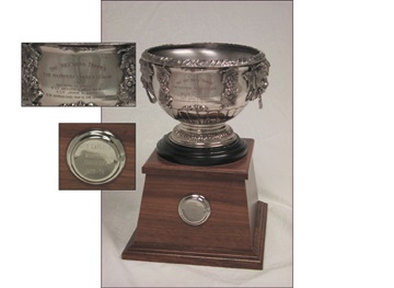 In 1976, Guy Lafleur lit the lamp 56 times and added sixty-nine assists for a points total of 125 on the year. This achievement was rewarded at the NHL Awards Dinner where he was presented with The Art Ross Trophy "To Be Awarded Each Year to the Leading Scorer" of the National Hockey League. This intricately sculpted silver-plate bowl rests on a substantial pedestal of wood. Vintage green felt covers the base. The attached circular plate reads "Guy Lafleur, Montreal Canadiens, 1975-76." A seldom seen personal award, ready for display in your trophy case. In excellent condition. Letter of Authenticity signed by Guy Lafleur.