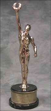 The Victor Awards are an acknowledgement of outstanding athletic achievements in Sport. The award, regarded as the sporting equivalent of the Academy Awards, is presented at a lavish affair held in Las Vegas each year. A single award is presented for each sport. This figural trophy in gleaming gold plate is mounted on a substantial black marble base. The attached plaque reads, "Twelfth Annual Victor Awards, Guy Lafleur, Ice Hockey, Voted by the National Academy of Sports Editors and Broadcasters, 1978." In excellent condition. Letter of Authenticity signed by Guy Lafleur.