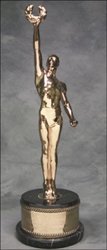 The Victor Awards are an acknowledgement of outstanding athletic achievements in Sport. The award, regarded as the sporting equivalent of the Academy Awards, is presented at a lavish affair held in Las Vegas each year. A single award is presented for each sport. This towering figural trophy in gleaming gold plate is mounted on a substantial black marble base. The attached plaque reads, in part, "Thirteenth Annual Victor Awards, Guy Lafleur, Ice Hockey, Voted by the National Academy of Sports Editors and Broadcasters, 1979." In excellent condition. LOA signed by Guy Lafleur.