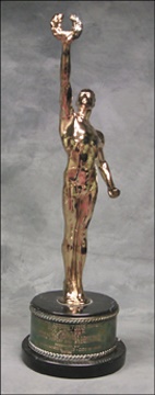 The Victor Awards are an acknowledgement of outstanding athletic achievements in Sport. The award, regarded as the sporting equivalent of the Academy Awards, is presented at a lavish affair held in Las Vegas each year. A single award is presented for each sport. This figural trophy in gleaming gold plate is mounted on a substantial black marble base. The attached plaque reads, in part, "Guy Lafleur, Comeback Player of the Year, In Recognition Of Your Performance In Retaining Your Stature As One Of The NHL's Brightest Stars." In excellent condition. LOA signed by Guy Lafleur.