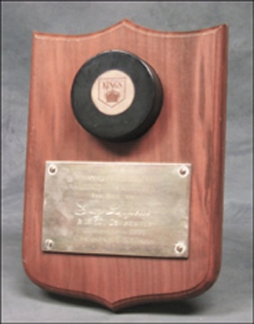 On October 23rd, 1971, the rookie Guy Lafleur found the twine at the back of the net at the Los Angeles Forum for his first goal in the National Hockey League. To say it would be the first of many would be an understatement. This historical moment has been eternally preserved on a silver plaque reading, in French, "Souvenir Puck, National Hockey League, 1st Goal of Guy Lafleur at 18:52, 2nd Period, October 23, 1971, Canadiens vs. Kings." Mounted above is the Los Angeles Kings Converse game puck, plucked from the net after the goal. In excellent condition. Letter of Authenticity signed by Guy Lafleur.