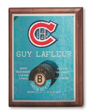 The inscription on this one reads, in French, "In memory of your exploits on March 29, 1975 in the Forum against the Kansas City Scouts." On this night, Guy reached the single season fifty-goal mark for the first time. This is a feat he would repeat five more times over his career. This attractive wooden plaque, presented to Guy by the Montreal Canadiens, displays the puck from the milestone goal mounted on anodized blue aluminum below the tri-color three dimensional Habs logo. In excellent condition. LOA signed by Guy Lafleur.