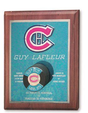 Having broken the Rocket's record, Guy finished the 1974-75 season with a total of fifty-three goals. The bar was reset a few years later when Guy hit sixty in a single season. This attractive wooden plaque, presented to Guy by the Montreal Canadiens, displays the game puck from the milestone goal mounted on anodized blue aluminum below the tri-color three-dimensional Habs logo. The details of the event are fully inscribed on the plaque. In excellent condition. LOA signed by Guy Lafleur.