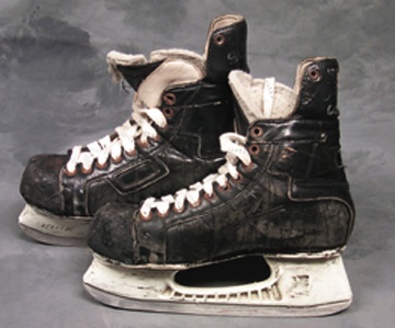 Battered pair of Bauer Supreme boots saw game action through three full seasons, according to Guy. Each boot is marked on the bottom with "Lafleur" and "1990-91" and each has a letter code. The blades are set into white Tuuk holders. These skates are well worn with rusted eyelets and years of battle scars. Guy claims that is the pair he wore in his last game in the National Hockey League. G.L. LOA.
