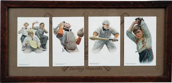This rare framed commercial piece from the early 1900's features a complete set of four 3.75 x 5.5'' postcard sized color lithographs. All of the baseball inspired artwork was originally painted by Robert Robinson and published by Edward Gross and Curtis. Available at the time only in this form, all four cards are mounted on original matte with bat and ball motif. Completely original including the wood frame. NRMT. Framed to 9 x 19''.