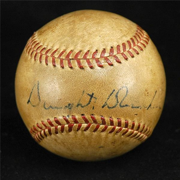 Rare presidential signed baseball by Dwight D Eisenhower. Well, but evenly, toned baseball is signed in blue ink on the sweet spot. Signature is a solid 7/8 on 10 scale. JSA LOA.