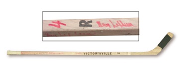 Over four and a half seasons in the Quebec Junior League Guy amassed an impressive record of 314 goals. Guy scored number 300 with this stick. Stamped "Remparts" with the number "4" marked near the handle in black marker, this club has a knob tape job that is will be very familiar to collectors of his later NHL gamers. A pair of vintage red marker signatures appear on the shaft near the handle. An additional inscription in red reads "300th But - 2 Mars 1971 - Souvenir. The stick shows decent use with no visible damage and all of the original tape is intact. A milestone! LOA signed by Guy Lafleur.