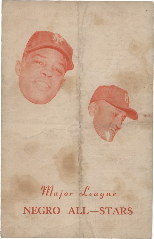On the front and back cover of this unscored 1955 Negro League All-Star program is an image of the "Say Hey Kid" in his Giants cap. Inside is the team's roster as well as that of the Visitors which includes, in addition to Mays, such names as Doby, Banks, Aaron, Gilliam, and Irvin. Overall Good-VG, with horizontal and vertical center folds.