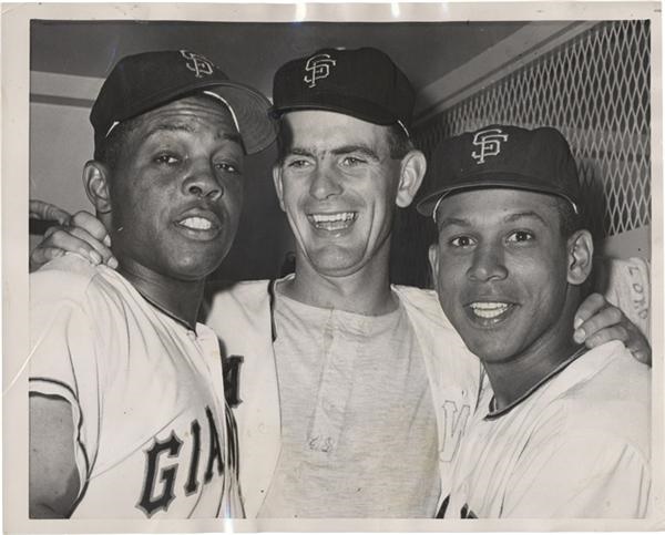 Gaylord Perry is flanked by fellow San Francisco stars Willie Mays and Orlando Cepeda after the victory in 1963 that moved them into first place in the NL. Associated Press photo stamp. Original paper caption. Original press clippings. EX-MT. 10x8”.