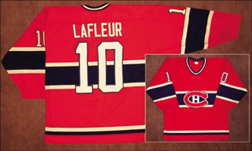 The historic blue, blanc et rouge uniform of the Montreal Canadiens was worn during the 1984-85 season, Guy's last year with the Habs. Away CCM knit jersey with the "84/01" set tag in the neck along with the CCM company tag. Nameplate reads "Lafleur" with "10" on the back and sleeves and the Habs logo centered on the chest. The sweater shows loads of game use with numerous circular team repairs just the way collectors love them. This fantastic game worn jersey is the last away red jersey worn by Lafleur with the Canadiens. One of the finest Lafleur gamers we have seen. LOA signed by Guy Lafleur.
