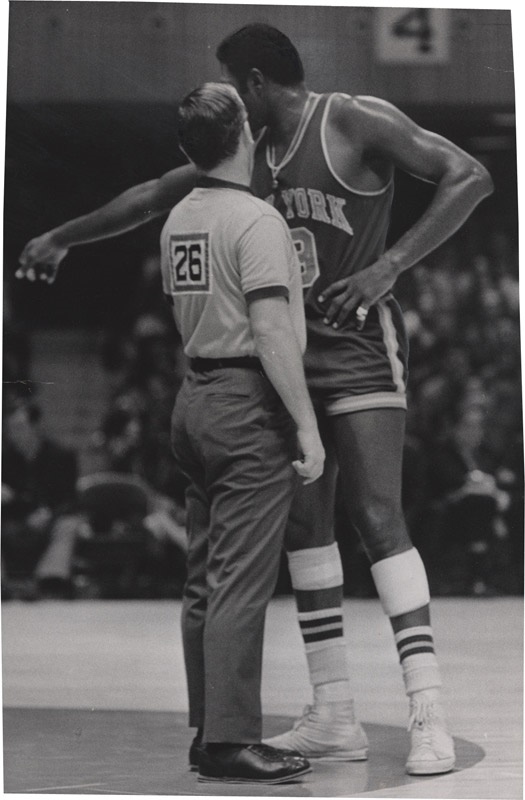 (31) photos track Willis Reed's whole basketball career from his day playing with the Knicks to coaching. Most of it relates to the Knicks including MVBP of the 1970 playoffs, punching out Rudy La Russo (1966), several 1960s-70s NBA promo stills, becoming Knicks all time leading scorer, season MVP, getting hurt in 1970 playoffs (with Chamberlain), rookie of the Year visiting Tom Gola in hospital, retirement. Some are lasers, many with publishing marks o/w EX. Overall 7x9".