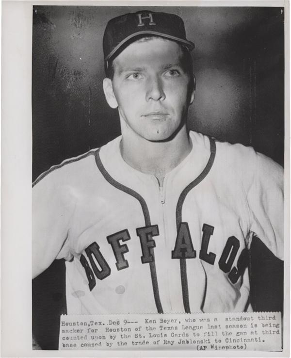 Super Buffalo Bisons photo of baseball player Ken Boyer, is a front caption wire photo taken as he is being groomed to fill the gap at third. Small tear o/w EX+ and 7x9".