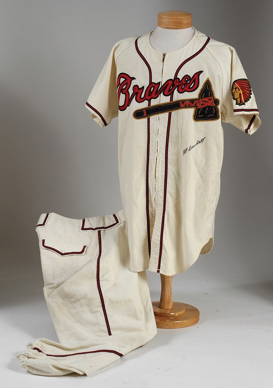 White Wilson wool uniform signed by Del Crandall in black sharpie (EX) on the breast. Jersey is size 44 with "Braves" and the tomahawk logo on the front, "8" on the reverse and an Indian head on the sleeve. The pants are size 38. Both are in terrific shape (some toning and minor stains ­ "8" patch is beginning to separate).