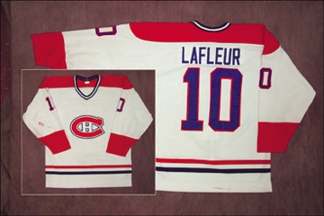 At least a dozen circular team repairs tell the tale of Guy's last season with the Canadiens. This home white CCM knit gamer, tagged "84/01," was worn during the 1984-85 campaign and was brought home as a souvenir on the night Guy waved to the Forum crowd for the last time. The shirt has number "10" on back and sleeves and "Lafleur" on the namebar. The use is quite evident with numerous marks, board burns and repairs. This fantastic uniform is the last home white jersey worn by Lafleur with the Canadiens. A magnificent example of a Lafleur gamer. LOA signed by Guy Lafleur.