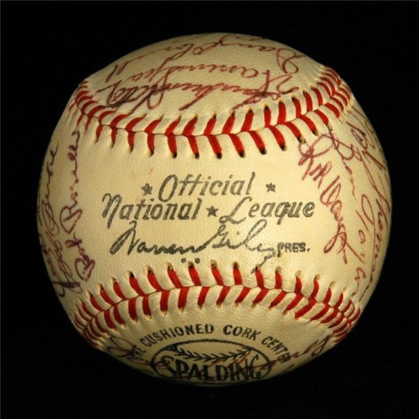Official National League Giles Baseball signed by 29 members of the team including Hank Aaron, Charlie Grimm, Del Crandall, Warren Spahn, Andy Pafko, Johnny Logan, Del Rice, Bucky Walters, Bob Thomson, Ed Mathews and more. Signatures are 8/9 on scale of 1-10, ball is just lightly toned.