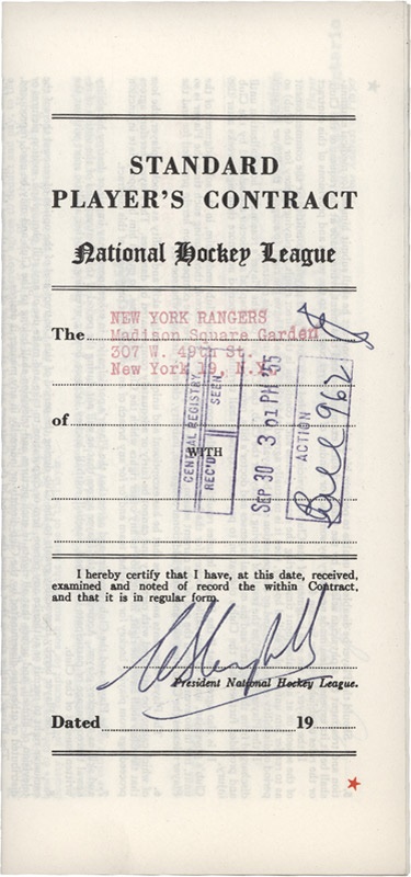 Official NHL Standard Players Contract signed by Hall of Famers Harry Howell, Murray Patrick and Campbell. Fully executed. Mint.