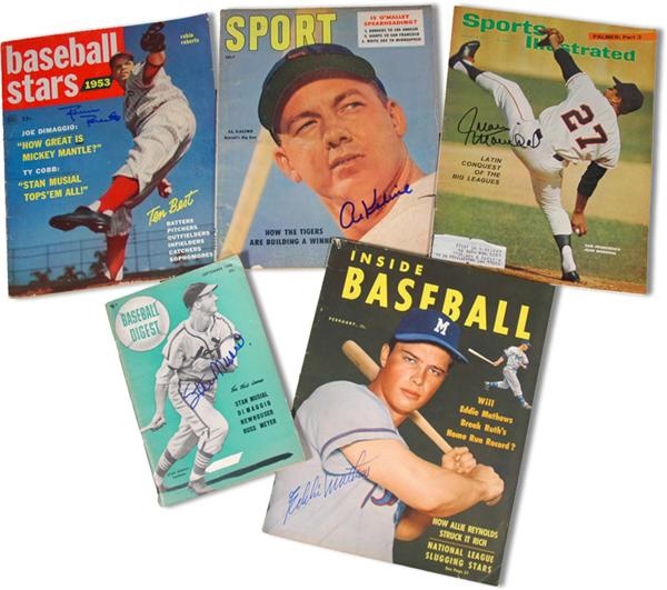 All are complete magazines signed on the covers in mint sharpie. Includes Sport Magazine sigend by Al Kaline, Inside Baseball signed by Ed Mathews, Sports Illustrated signed by Juan Marichal, Baseball Stars Signed by Robin Roberts and Baseball Digest signed by Stan Musial.