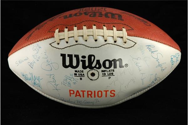 Wilson white panel football signed by almost 50 members of the 1979 Patriots. Includes Steve Nelson, Steve Grogan, Mike Haynes, Sam Cunningham, and more.EX-MT. All are signed in blue ballpoint.