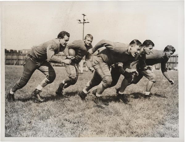 6.5x8.5 black and white news service photo of members of the College All-Stars preparing for their game against the Green Bay Packers. Pictured are Heisman Trophy Winner Nick Kinnick, Granny Lansdell, Harry Smith, Johnny Haman and Esco Sarkkinien. Some yellowing and minor wrinkling but in overall fine shape.