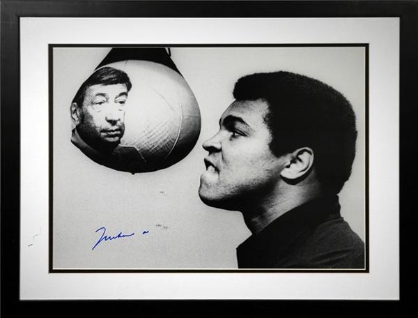 Great image of Ali giving the fight look to a punching bag with an image of Howard Cosell. Signed in mint blue sharpie. LOA Triple Crown Sports Memorabilia. Professionally framed and matted.
