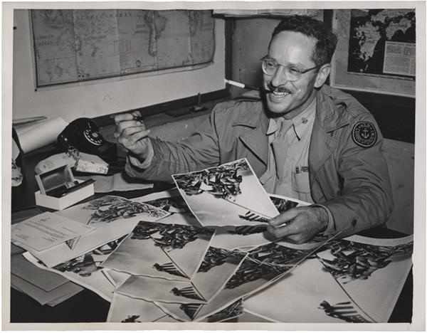 (2) news service photos of photographer Joe Rosenthal. Rosenthal won the Pulitzer Prize for his WWII photo of Marines hoisting the flag atop Mt. Suribachi in Iwo Jima, an amazing image that has come to represent the honor and sacrifice of American armed forces. Includes: 7 X9 image from 1945 of Rosenthal autographing reprints of the famous image; 8x10 image from 1965 of an aging Rosenthal with the image on its 20th anniversary. Both NM to MT with original caption sheets affixed to verso.