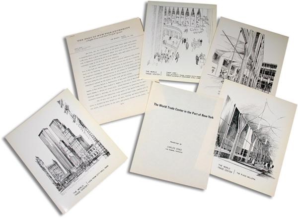 From the archives of the San Francisco Examiner, an incredible (22) piece press kit announcing the construction of the World Trade Center in the Port of New York. Includes (7) typed documents including announcements by the governors of New York & New Jersey, The Port Authority, architect Minoru Yamasaki and more. Also, (15) renderings reproduced on photo paper of the yet to be constructed WTC. Images include Plaza Galleria, view from City Hall Park, Main entrance to the Plaza, construction schematics and more. These historically relevant, yet sobering, documents and images are in mint condition.