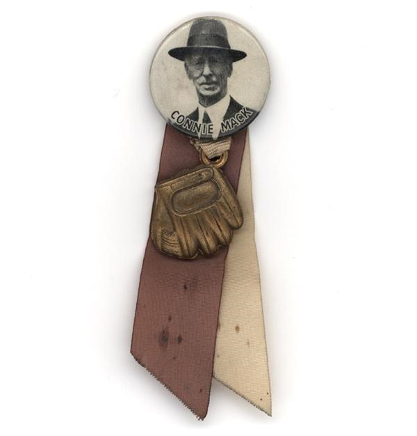 Rare PM10 pin featuring A's HOF manager Connie Mack. Pin looks nice with good, clear image of Mack and a baseball glove charm. Brown and white ribbon have some spots, but are still fine. Fantastic baseball collectable!