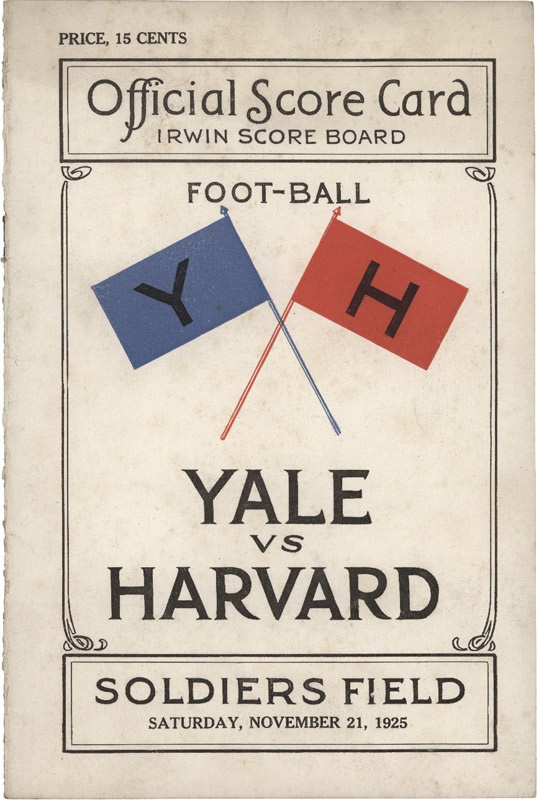 Fascinating Harvard-Yale football program from their match-up at Soldier Field on November 21, 1925. Program is in EX condition and contains photos of each team, the day's line-up and team statistics.