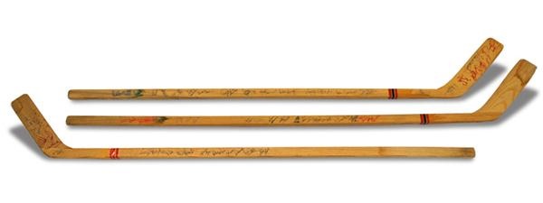 Three Louisville Slugger souvenir sticks with the likes of Gretzky (on two of the sticks), Howe, Bossy, both Espositos, Trottier, Robinson, and more. A few of the signatures are bled but most are at least 8/10 in strength.