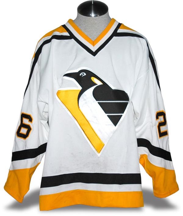 Home jersey is a Starter size 54 and shows nice use with lots of stick marks on the outside and some pilling inside.