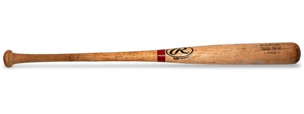 Fantastic 34.5" Rawlings Adirondak Big Stick baseball bat, game used by Red Sox slugger David Ortiz. The bat has Ortiz' name printed on the barrel, shows lots of use, red bat rack marks, blue ball & has plenty of pine tar! appears something was removed from the knob. Knob is imprinted with "M456B". Uncracked.