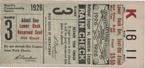 Amazing ticket stub from the 1926 World Series, Game 3, played at Sportsman Park in St. Louis. Stub is in VG condition with a couple of slight creases, but appears very clean. Nice!
