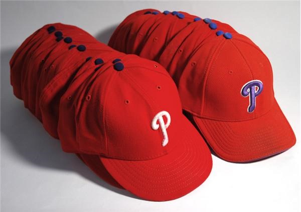 A collection of 22 game used hats by members of the 2006 Philadelphia Phillies. Includes: Clay Condrey, Jayson Werth, Shane Victoria, Pat Burrell, Abraham Nunez, Wes Helms, Jimmy Rollins, Chris Roberson, Carlos Ruiz and more. Thirteen are game style red wool and nine are batting practice worn editions. Game hats have white "P". BP hats have blue "P" and mesh-like exterior surface. All are from the MLB Authentic Collection by New Era. Condition varies from barely used to heavy sweat marks (most are in good shape). Player numbers are written in black sharpie on underside of the brim.