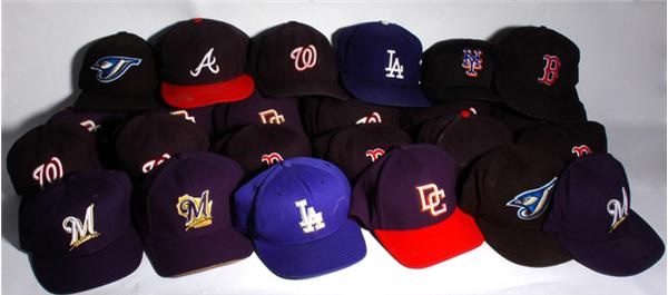 Huge lot of (28) game and BP used Major League baseball caps from 2006. Includes: Mets #19 Heath Bell, (2) Braves #5 Todd Pratt, Blue Jays #2 Aron Hill, Dodgers #55, Rockies #33, Milwaukee #15 Ben Sheets, #6 Jeff Cirillo, (2)#8 Vinny Rottino, #31 Dave Bush, Red Sox (2) #54 Carig Breslow, Nationals (2)#26 Ramon Ortiz, (2)#3 Jose Vidro, (2)#18 Melvin Dorta, (2)#00 Brandon Watson, #7 Wiki Gonzalez, and unknown player caps from the Nationals, Jays, Dodgers and (2) Red Sox.