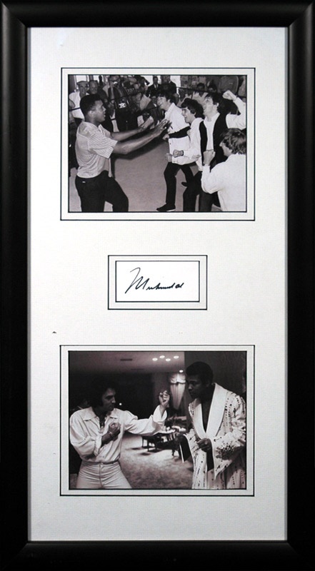 Funny, 11.5 x 20.5 " framed display of Muhammad Ali photos and signature. (2) Photos in display are of Ali "boxing" with all four Beatles in the ring at the same time and sparring with Elvis in a hotel suite. Great photos and mint signature.