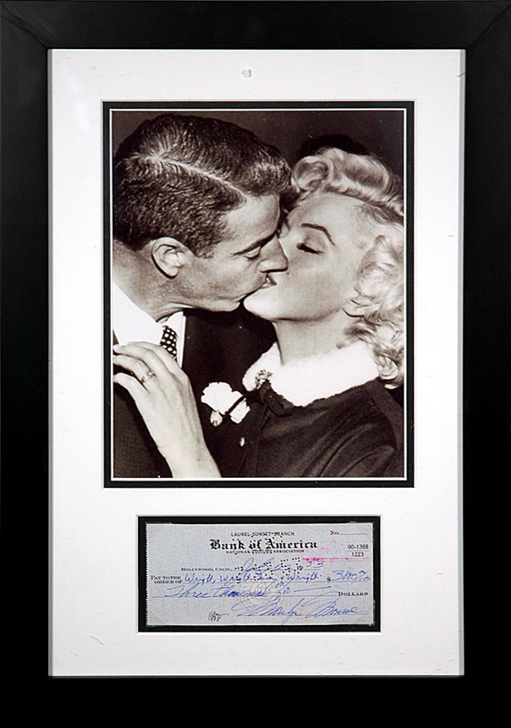 kissing Joe DiMaggio with a Monroe signed check underneath. The check is