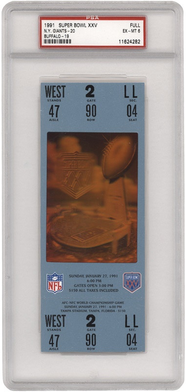 Full ticket for $150 was never used. The New York Giants defeated the Buffalo Bills 20 to 19. Graded 6 (EX-MT) by PSA.