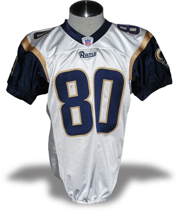 Worn by Bruce on December 3, 2006 while playing against the Arizona Cardinals. This is the jersey that he wore when he hit and passed the 13,000 total yards mark in his career. He is only the 9th player in NFL history to reach this milestone. Jersey shows use with some paint transfer marks. Reebok size 44 with "05-44 S" tagging in collar. Also, Prova Group authenticating tags in collar. Shortened with elastic around the waist. Signed (7/10) in silver on the back "Isaac Bruce 13,000 yds." Comes right from Isaac Bruce with his LOA.