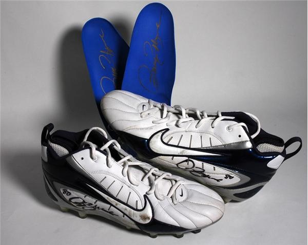 Game worn Nike size 12.5 both have "80" written on the backs of the heels. Both are signed in 8/10 black Sharpie by Bruce and show nice use with dirt and grass stains. Pair of custom arch supports are both signed by Bruce in 9/10 gold paint pen. LOA from Isaac Bruce.