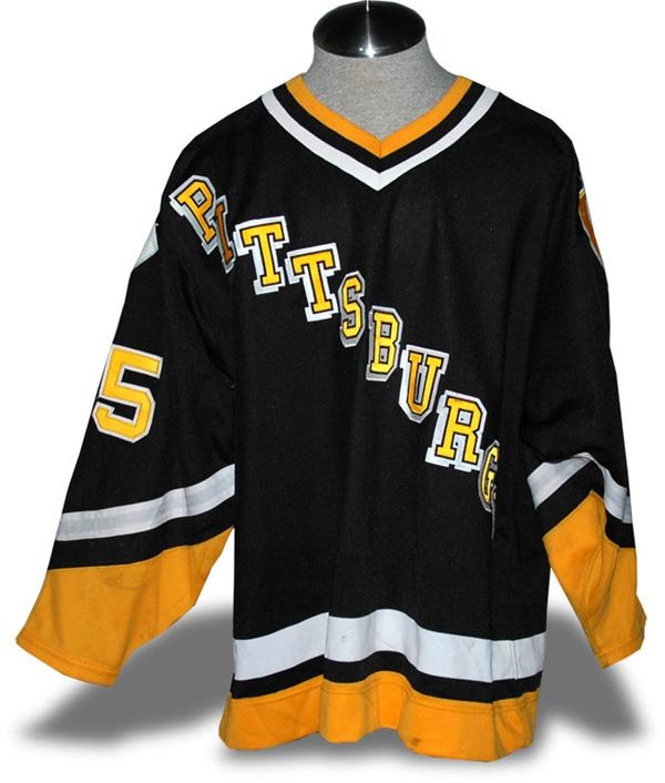 Road jersey has Maska and size 54 tagging in the collar. Number 25 on back and both sleeves. Name also on back. Moderate use with stick marks, a few burns on the sleeves and pilling inside.