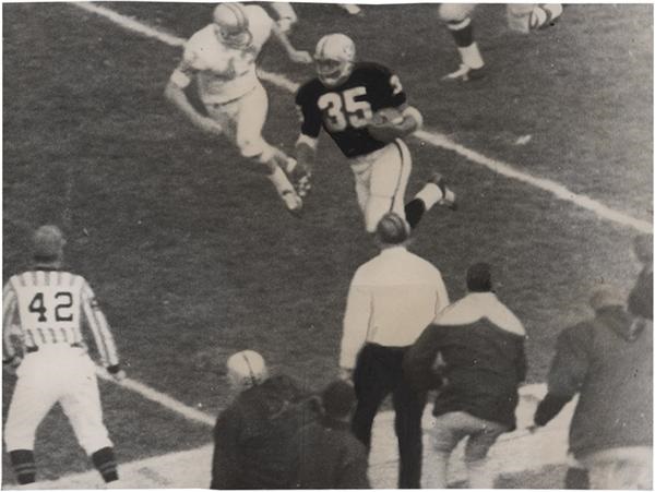 Game action, Pete Banaszak running with the ball (8 x 12'') and Hewritt Dixon running with the ball (7.5 x 10''). Both have original newspaper clippings attached to the back showing that they were used in the paper. VG-EX.