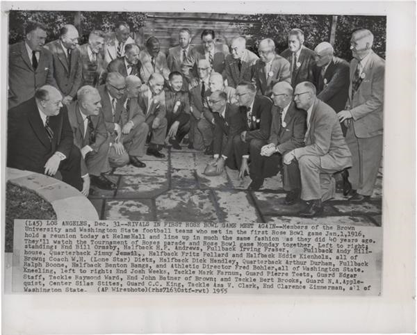 Surviving members of the Brown University and Washington State Football team, participants in the 1st Rose Bowl, meet in Los Angeles before the start of the 1956 Rose Bowl Game. 8 x 10''. EX-MT.