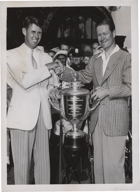 Byron Nelson and Henry Picard meet in Flushing New York. Original caption sheet on the back dated 7/15/39. 6 x 8''. EX-MT.