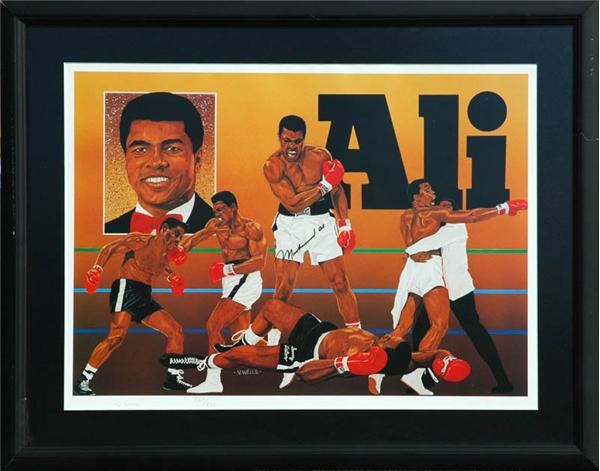 Signed by Muhammad Ali in mint black sharpie. Also signed by the artist V. Wells in pencil. #392 of 500. 18 x 24''. Framed to 24 x 30.5''.