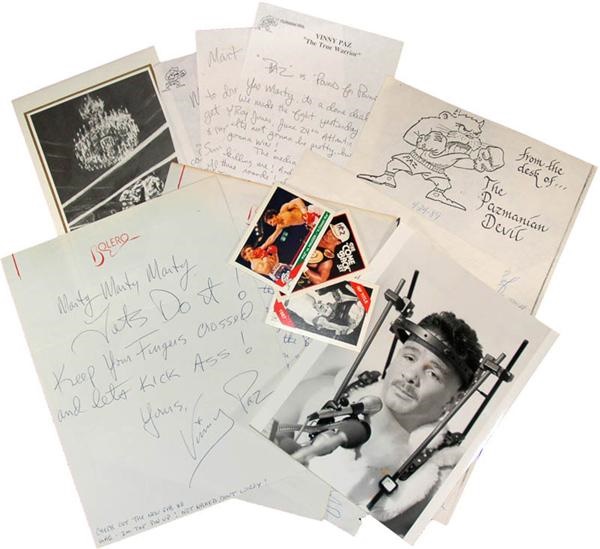 Interesting lot of ephemera related to this five time boxing champion who made a famous comeback after being involved in a car accident and being told he would never fight again. Includes ten handwritten and signed letters, four photographs, Boxing invitation card and set of limited edition trading cards. Mint.