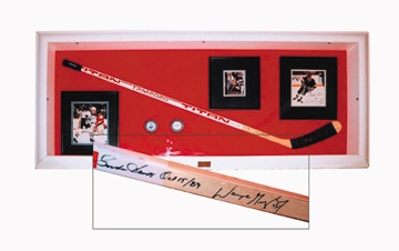 On October 15, 1989, Wayne Gretzky scored in overtime to surpass Gordie Howe's Career NHL Points Record of 1850. This Titan TPM 2020 is one of thirteen sticks used in this historic game and each was dated, signed and numbered by Gretzky. Wayne owns the record breaker (#2) and two others, (#1 & #4) are on display at the Hockey Hall of Fame in Toronto. The stick is dated and displays the bold black autographs of Wayne Gretzky and Gordie Howe. A gold plate attached to the blade reads "Number 3/13 used by Wayne Gretzky on the night he became hockey's all-time leading scorer, October 15, 1989". The stick is correctly stamped and taped and has the black "Gripper" handle used by Wayne throughout the 1988-89 season. This milestone gamer is displayed in a large shadowbox frame along with a pair of game pucks and three framed photos: one of Wayne and Gordie, an Oilers action shot and an autographed Kings 8x10. This stick was donated by Walter Gretzky to the Kidney Foundation of Canada in 1989 and was the grand prize in a raffle held in 1991. Included is a Letter of Authenticity from the Kidney Foundation and a photo of Walter Gretzky presenting the stick. Your chance to obtain this monumental museum piece from Wayne's most significant milestone.