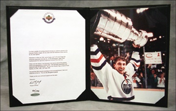 Fabulous content typed letter talks of his days with the Edmonton Oilers. Speaks of his Stanley Cup Championships and greatness. Truly a special piece as far as content housed in a beautiful portfolio with image of him hoisting the Stanley Cup. In its original box with Upper Deck Authenticated packaging, this is quite attractive. Limited edition #86/199. Mint. This piece is a sleeper that will someday be truly appreciated.