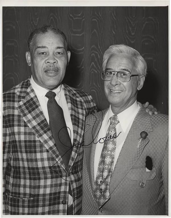 8 x 10'' photo of Joe Louis with former president of Caesar's Palace Mr Weinberger. Signed by Louis in black ink. Photo by the Las Vegas New Bureau. EX-MT.