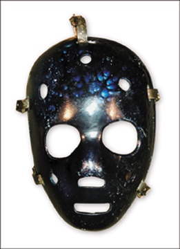 Midnight blue paint covers this heavy fiberglass mask from the very early 1970's.  Most likely built from a home kit available at sporting good stores, this one is similar in style to pro masks worn by Gerry Cheevers and Gilles Meloche.  Complete with original straps and in excellent condition.